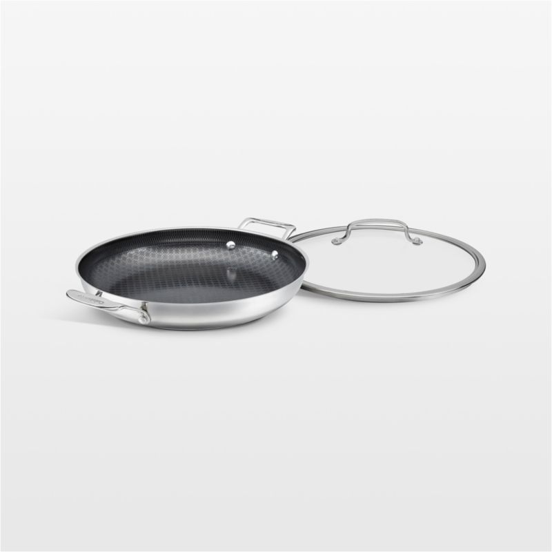 Cuisinart's FushionPlus cookware lets you sear, saute and brown with chef-worthy results. The everyday pan is ideal for cooking larger cuts of meat, stir-fries and stews. An aluminum core ensures quick and even heating, while PurelySear ceramic non-stick technology delivers the perfect searing of stainless steel along with the easy-release of non-stick ceramic. For added durability, the Armorguard interior layers a stainless steel grid on the cooking surface to protect the non-stick ceramic coating underneath. Rimmed in stainless steel, the tempered glass lid seals in juices while providing a peek at the cooking progress.