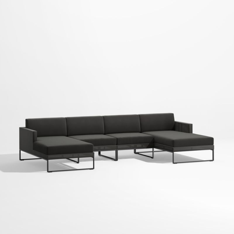 Our urban-style Dune outdoor sectional forms the centerpiece of a truly modern "indoor room" that lives outside. Creating the ultimate in lounge, the four-piece sectional combines two armless chairs with left-and right-arm chaises. Outdoor-grade aluminim constructs the sleek linear frames cloaked in black synthetic mesh that's resistant to fading, mold, tears and stains. Custom-fitting cushions neatly tailored in black weather-resistant acrylic add a layer of comfort. The Dune U-shaped black outdoor chaise sectional is a Crate & Barrel exclusive.