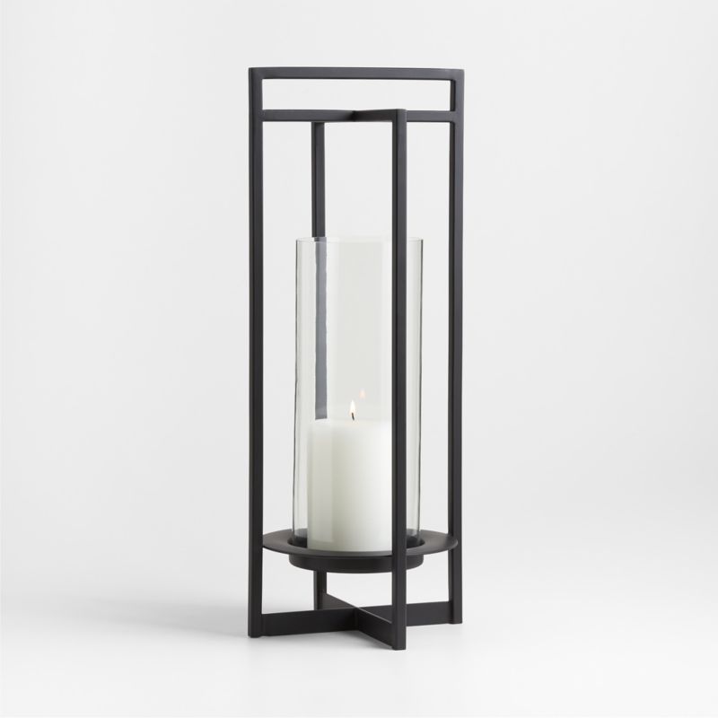 Illuminate the outdoors with this lantern inspired by our Dune furniture collection. Crafted of slender, squared-off rods, the X-shaped lantern frames a glass hurricane in crisp black lines. The top crossbar serves as a convenient carrying handle for repositioning the lantern on your porch or patio or for toting indoors. Pair the medium Dune lantern with its small and large counterparts for a lovely and linear candlelight display.