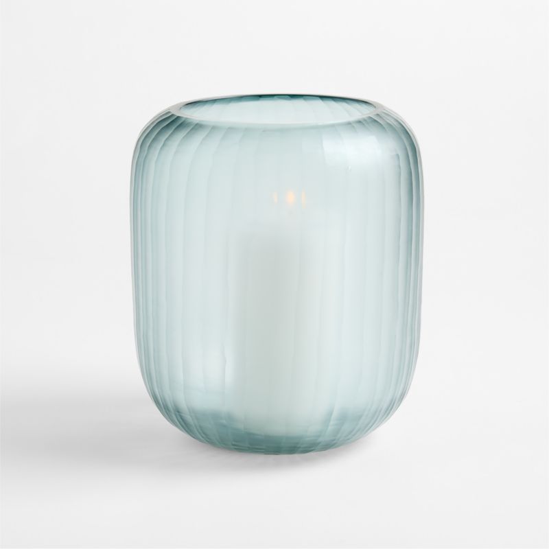 Our Eden hurricane sets a serene mood indoors or out. Hand-blown glass in a dreamy shade of blue shapes the large candle holder, subtly rippled with organic fluting etched by hand. The frosted finish and sea-inspired hue diffuse light beautifully, casting a beachy glow that suits coastal casual or elegant modern decor.