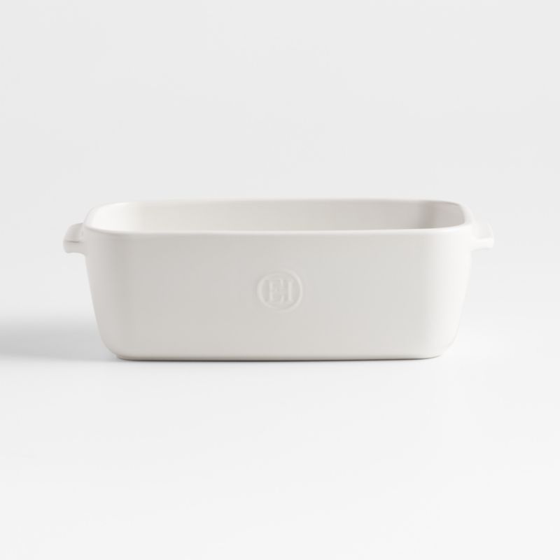 In this beautiful collection designed exclusively for Crate & Barrel, the classic and beloved ceramic bakeware of Emile Henry gets a modern update with softly curved organic lines and refined details. This loaf pan's clean, rounded corners and minimalist—yet functional—handles go from oven to table for serving quick breads, lasagna and loaf cakes. Crafted of Burgundy clay renowned for its superior heat retention, the pan is finished inside and out with an exclusive matte cream glaze that resists chipping, cracking and thermal shock. All of the heirloom-quality pieces in our Emile Henry collaboration make extra-special housewarming, graduation and wedding gifts.