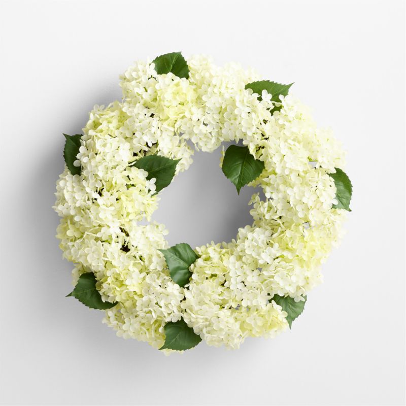 Our faux hydrangea wreath showcases the summer favorite at the height of its loveliness. Surrounded by glossy sawtooth leaves, creamy petite petals cluster in a ring of irresistibly fluffy pom-poms. Lush, life-like and unparalleled in quality, our wreath charms on a door, above a mantel or serving as a candle ring on a brunch table.