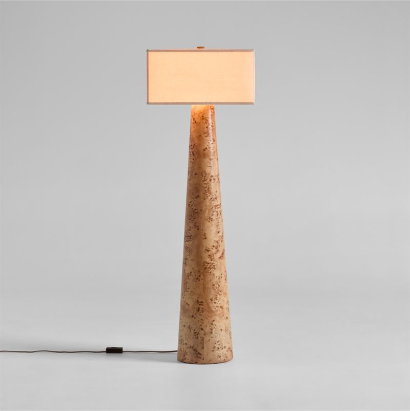 The organic swirls of prized burl wood animate the crisp geometry of our Gains floor lamp. Wrapped in gorgeous and uniquely patterned mappa burl veneer, the conical base rises to an ivory linen box shade. Thoughtfully designed, the ivory linen shade casts beautiful, diffused light. Brigette loves using a Gains lamp to illuminate a corner—or two flanking a sofa for a chic and sculptural presence.