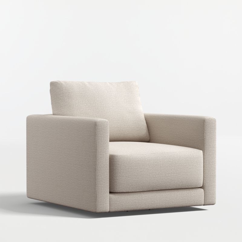 Striking the perfect balance between comfort and modern style, Gather is clean-lined and current. The deep-seated swivel chair features a boxy, extra-plush seat cushion made with inner-coil construction for maximum comfort and durability. A fiber-filled back cushion settles you in for the ultimate lounge, while the 360-degree swivel to give you a sweeping view of the room.