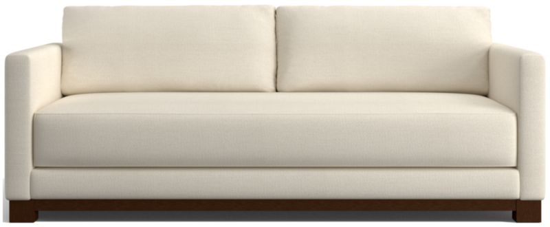 Striking the perfect balance between maximum comfort and modern style, our Gather sofa is clean-lined and current. Anchored by a wood base, the deep-seated sofa features a boxy, extra-plush seat made with inner-coil construction for maximum comfort and durability. Fiber-filled back cushions settle you in for the ultimate lounge.