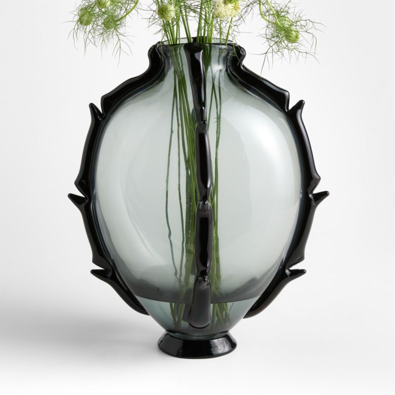 This eye-catching vase fascinates with contrast and individuality. Highly skilled glassblowers first create a classic urn-shaped vase of translucent smoky-green glass. They then apply opaque black glass details by hand to the still-hot vase, lining it in spiky appliques that remind us of vines or cut-edge leaves. Stunning on its own, this heirloom-to-be makes for a dramatic display of fresh botanicals.