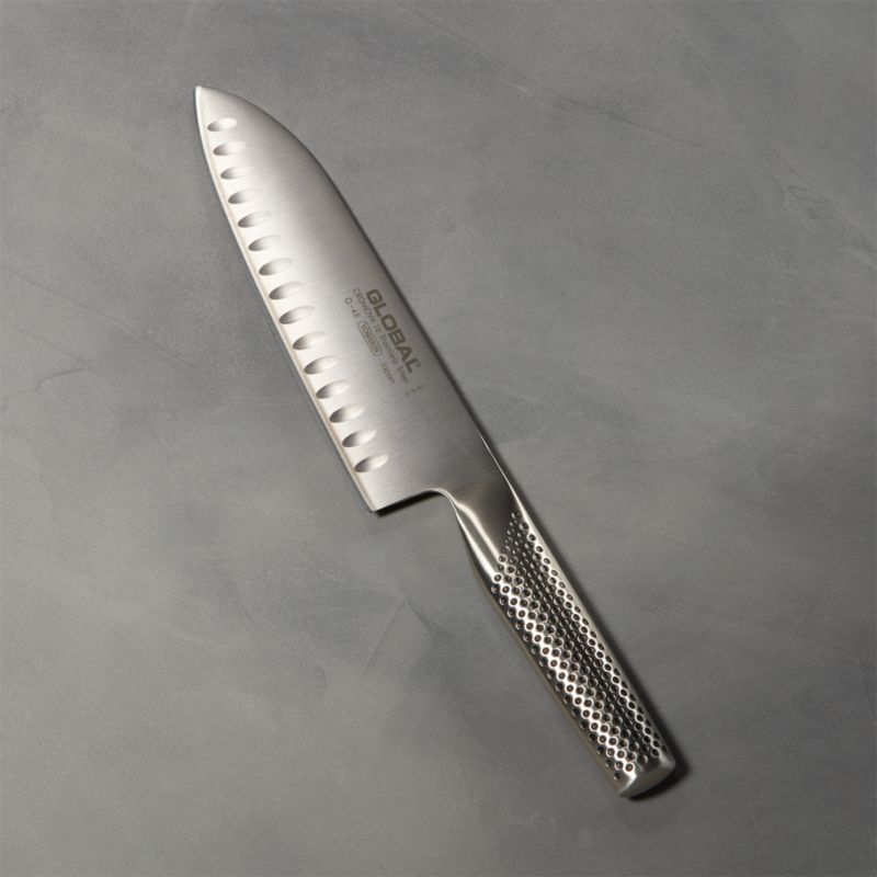 Crafted in Japan using a manufacturing method inherited from the Samurai sword, Global® cutlery features distinctive modern design with seamless, hygienic one-piece, stainless-steel construction, professional performance and a dramatic signature dimple pattern on the handles. Cromova 18 stainless-steel blades are ice-tempered and hardened to 56-58 on the Rockwell scale and sharpened by both ceramic water sharpener and whetstone. Slip-resistant, ergonomic hollow handles are filled with sand for ideal weight and balance. Santoku knives are known for their versatility in slicing, dicing and mincing, with hollow-ground construction to reduce drag and sticking.