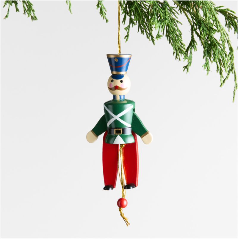 Our wooden soldier ornament brings the charm of a classic toy to your Christmas tree. Adorned with a red ball-pull rope on gold thread, the cheerful wood ornament is painted in bright red, blue, green, gold and snow-white. The jumping jack also makes a playful gift topper.
