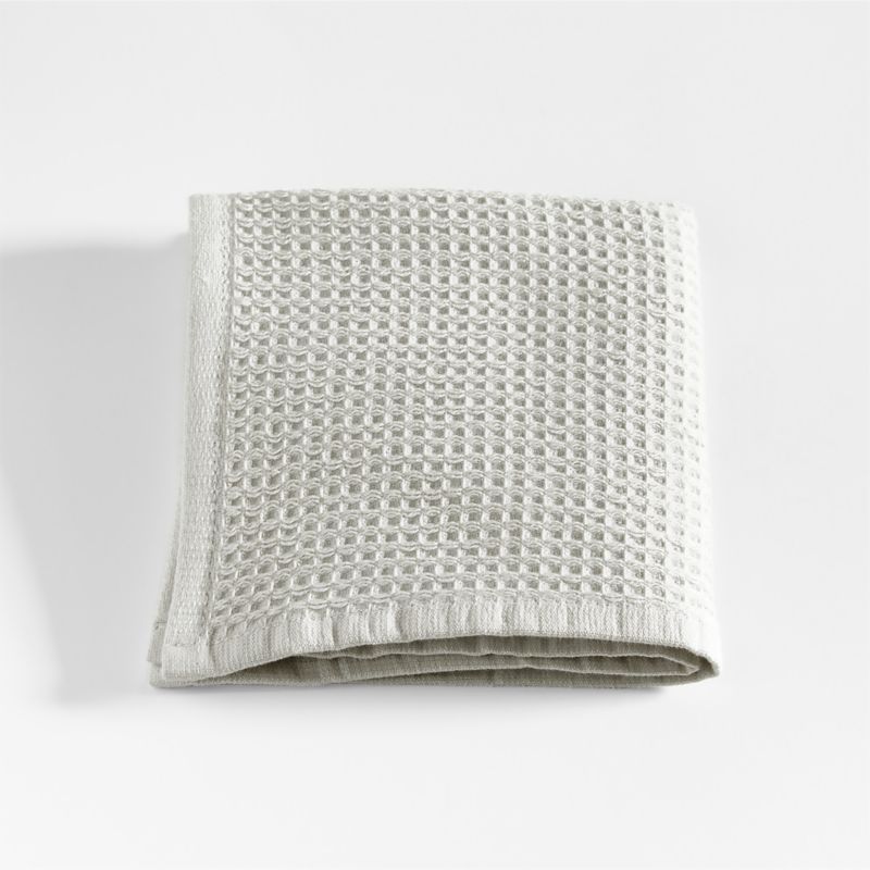 Uniquely textured with a waffle weave on one side, terry on the other, our organic cotton towels are exceptionally gentle on sensitive skin. The washcloth offers cozy softness and impressive absorbency. Give the entire bath the waffle-weave look with the matching hand towel, bath towel and shower curtain, all in light grey.