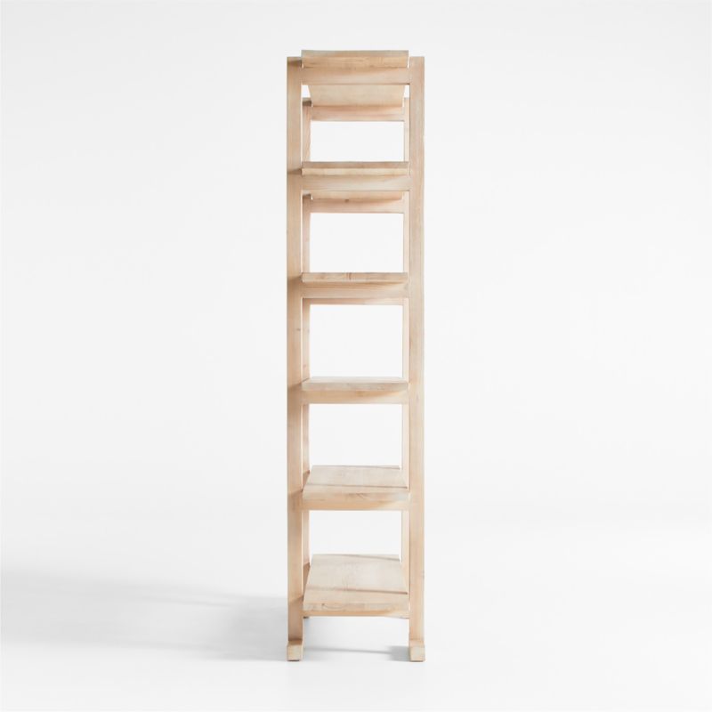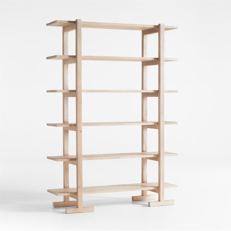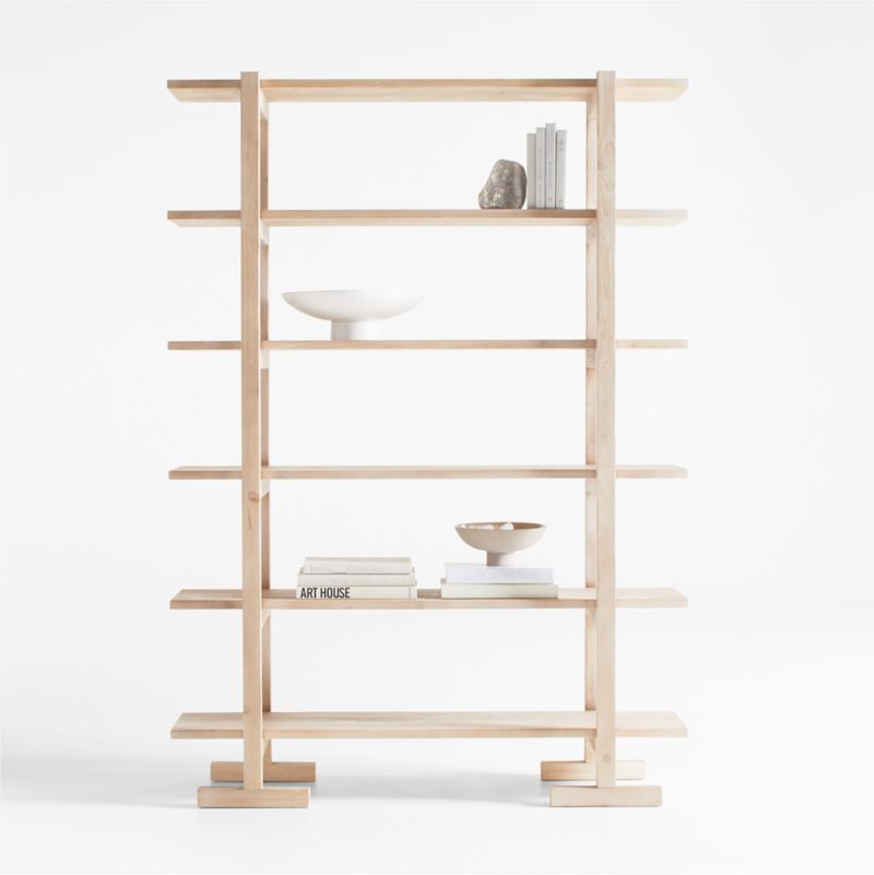 Inspired by vintage French bakery shelving, our Haldeman bookcase brings plenty of storage space to the modern home. The look is open and airy thanks to open shelves that extend beyond the uprights and T-shaped legs that let the bookcase float. Natural wood shelves offer organization—and the opportunity for stunning displays—in the home office, living room or kitchen. Or use as a functional room divider in an open-concept space.