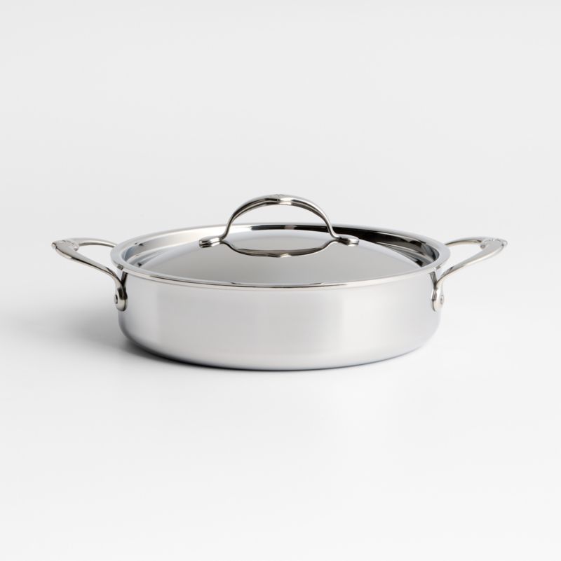 Fitted with handles thoughtfully designed by chef Thomas Keller, this mirror-polished stainless steel braiser gleams on the stovetop. The tri-ply pan sandwiches an exceptional conductive aluminum core between two layers of durable stainless steel for impeccable browning, braising and simmering. A thick flared rim pours without drips, and the stay-cool, seamless handles join the lidded pan with flush rivets for easy cleanup. Crafted in Italy for a luxurious look and professional performance, this oven-safe braising pan works with any type of stovetop and cleans quickly in the dishwasher.
