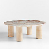 This set of two Homage side tables pays tribute to the beauty of natural materials with bold proportions and simple shapes. Styled with smooth bull-nose edges, the round top showcases the uniquely varied earth tones and dramatic veining characteristic of Toronto marble. An oversized cylindrical pedestal base complements with the lively grain of white oak, enhanced with an ivory ceruse finish.