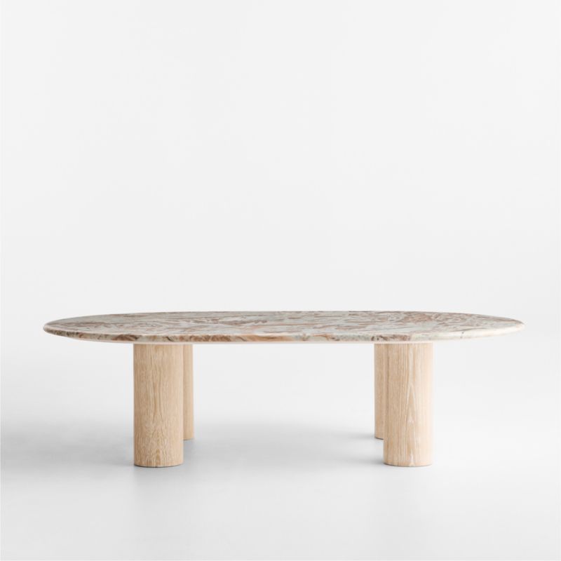 Our Homage coffee table pays tribute to the beauty of natural materials with bold proportions and simple shapes. Styled with smooth bullnose edges, the top showcases the uniquely varied earth tones and dramatic veining characteristic of Toronto marble. Oversized cylindrical legs complement with the lively grain of white oak, enhanced with an ivory ceruse finish.