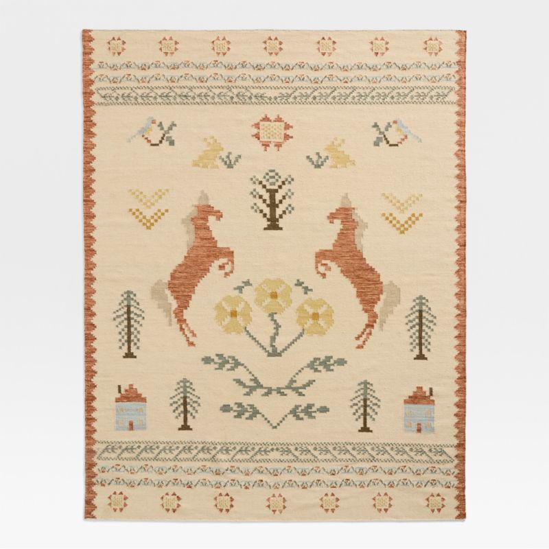 Our Homestead kilim rug from designer Louise Roe brings folk art charm and incredibly soft texture to the kid's space. Inspired by traditional cross-stitch patterns, the rug features a playfully sophisticated medley of leaping horses and flora with a zig-zag border. The wool blend is both durable and delightful underfoot.