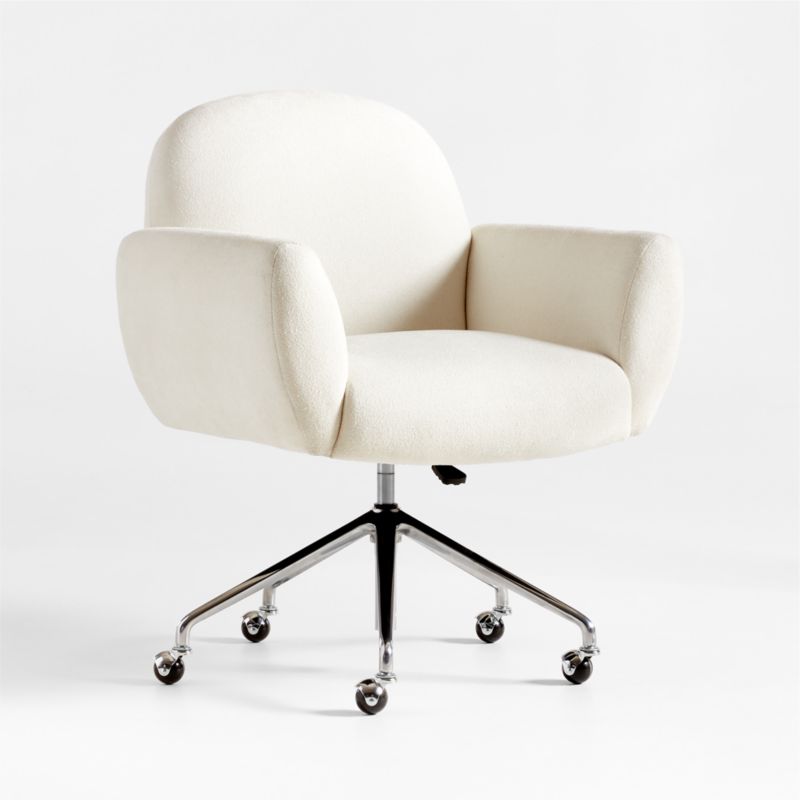 Settle into the living room-style embrace of our Imogen office chair designed for workday comfort. Upholstered in a velvety-soft fabric in decor-friendly ivory, the chair sits comfy and deep with open arms and plush cushions. A chrome-plated star base streamlines the look and rolls from desk to file cabinet on caster wheels. The Imogen office chair is a Crate & Barrel exclusive.