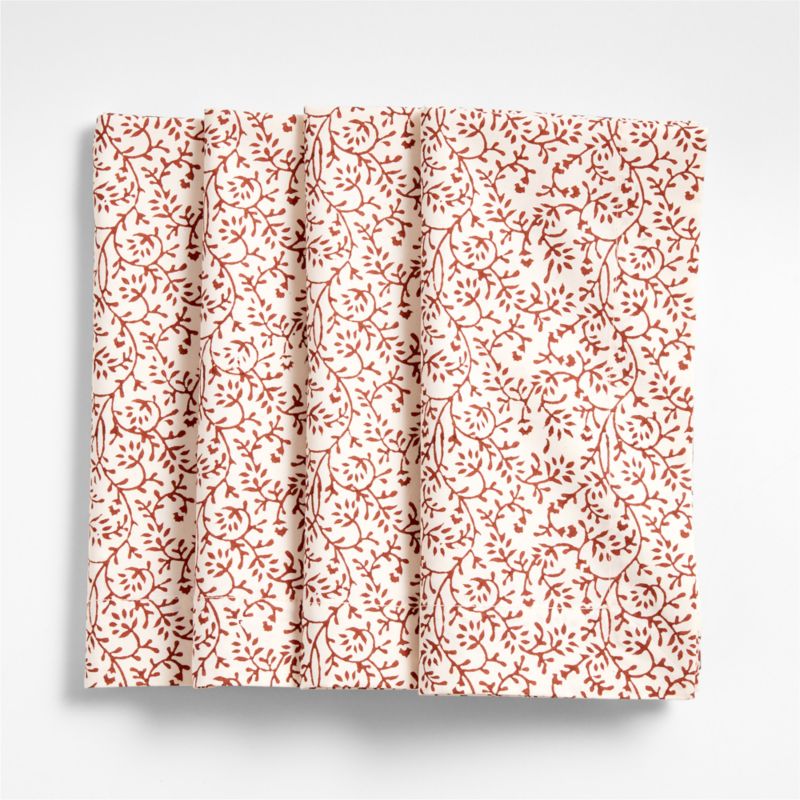 These patterned dinner napkins bring artisan style and quality to everyday meals or special occasions. Skilled craftspeople block print the chestnut brown-on-ivory pattern by hand, creating an intricate floral motif. Subtle variations in the hand-printed design make each organic cotton napkin beautifully unique.