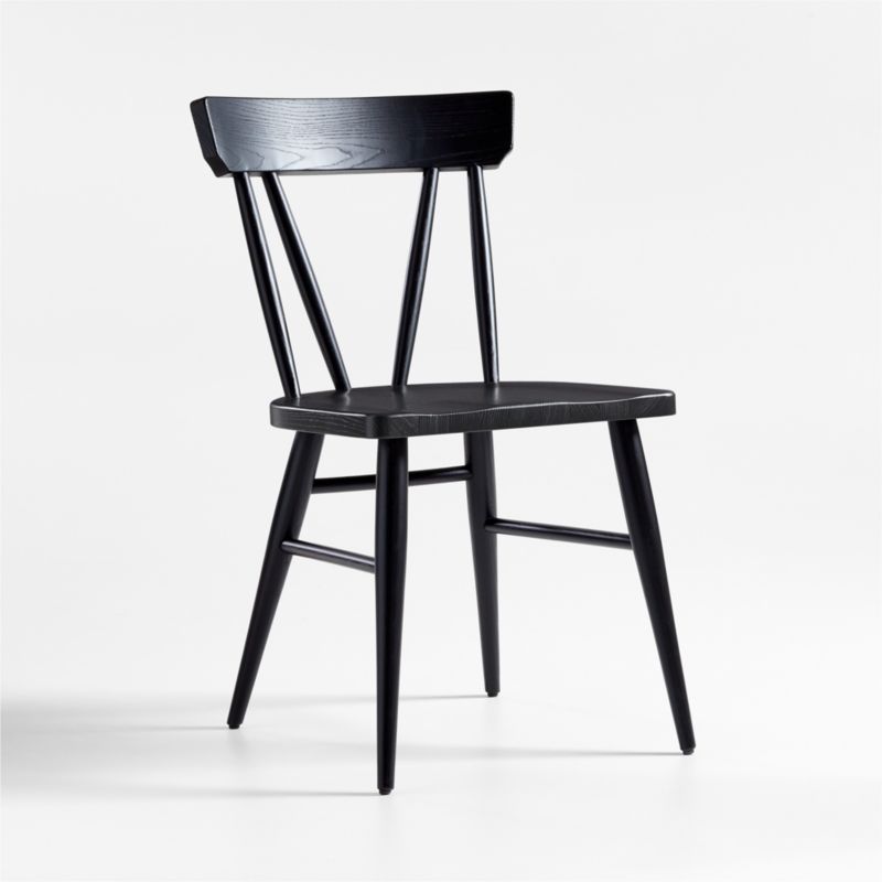 Fewer spindles and a chic black finish update the classic Windsor design with an easy air in our Juni dining chair. Channeling the casual attitude of Scandinavian farmhouse style, the ash wood chair relaxes with softened edges, tapered legs and spindles and sculpted, linger-worthy seat. A natural choice to pair with any of our dining tables, the Juni black dining chair is a Crate & Barrel exclusive.