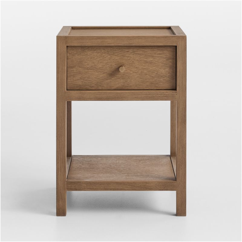 Refined and bold, Keane takes bedroom furniture beyond simple storage. Crafted of beautiful mahogany and meranti veneer with a warm driftwood finish, the nightstand features inset panels to draw the eye to its clean, architectural lines. The nightstand is the perfect size for smaller bedrooms while still offering plenty of storage with a drawer and open shelf.