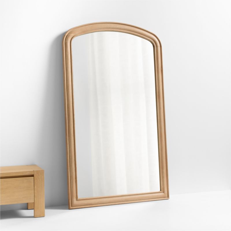 Inspired by Scandinavian architecture, our Kensington floor mirror showcases exquisite simplicity and the beauty of natural wood. Concentric carvings in the oak frame emphasize the arched rectangular silhouette while creating depth and shadows in the pale wood. Timeless and understated, the floor mirror keeps things modern and casual with a laid-back lean.