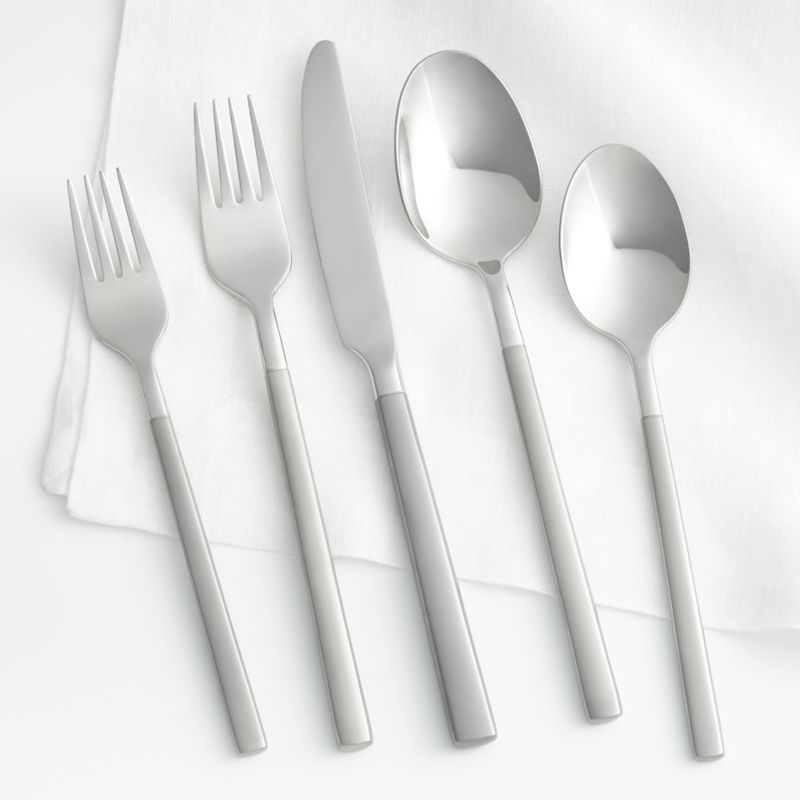 Streamlined modern stainless steel flatware features an eye-catching dual finish that contrasts frosted matte handles with mirror-polished heads and blades. Each of the four 5-piece place setting includes a salad fork, dinner fork, knife, spoon and teaspoon. For a unified table, pair with our Kenton serving set or any of our stainless steel serving utensils.