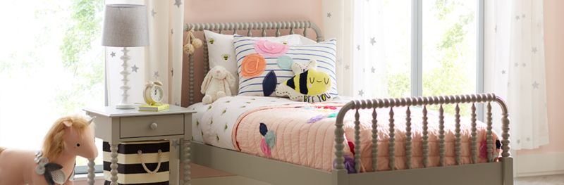 Blush pink walls set the scene for our floral bedroom inspiration for a young girl. A floral quilt adds pops of color with its embroidered blooms, which are accented adorably with a bumblebee throw pillow and sheets. Star themed curtains let sunshine stream in and pair with a fluffy white rug. We chose furniture with girly details but neutral colors to help make sure it will be useful for years to come. If your little one has a green thumb, complete the floral bedroom with her favorite fresh flowers, succulents and other plants.