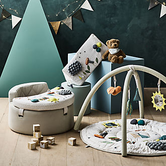 Looking for the best newborn gifts? Crate & Barrel's online baby shop has your family covered for the occasion. Whether shopping for a baby shower or celebrating the start of their first full circle around the sun, be sure to check out our new baby gifts. Animal-shaped rattles, for instance, introduce infants to simple stimuli, while silicone teethers help soothe newborns when they're a bit older. Other newborn gifts, like stuffed animals and mobiles help make the nursery their own. For new babies who are celebrating something special, like Easter, Hanukkah or Halloween, consider gifts for newborns that make it an extra-special day. On-theme baby activity mats make for practical yet fun new born gifts, while a baby sensory toy that's given as a newborn present helps encourage mental stimulation. Still not sure what to give as a gift for new babies? Go with something that's unique to them. Think personalized newborn gifts, like hooded towels that can be embroidered with your little one's name or initials.