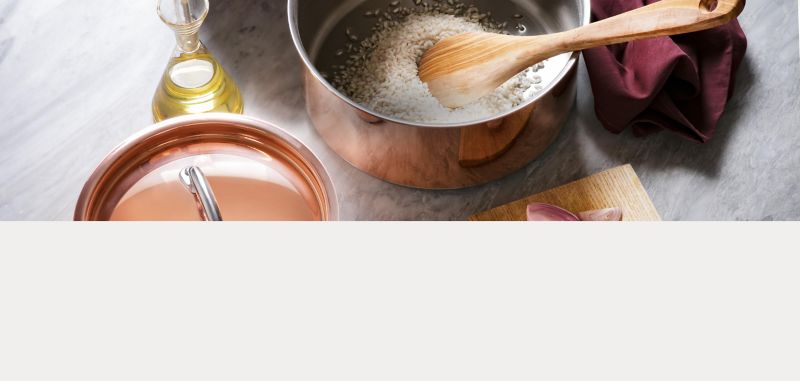Achieve a modern aesthetic in the kitchen with copper cookware. This metallic hue attracts the eye in a sleek or hammered set. If you're registering for your first cookware set or upgrading existing pieces, find sauce pans, fry pans, a stockpot and coordinating lids. For versatility, consider pans that handle the oven and broiler in addition to the stovetop. Then, add to your collection with a roaster in the modern shade as well to round out your copper pots and pans set. Incorporating kitchen tools and small appliances—KitchenAid standing mixers, cooking utensils, mixing bowls and a French press—in the same material keeps the look consistent. Complete the prep area by adding in other elements that contrast its shine, from a marble fruit bowl and a terracotta vase to a wood knife block and utensil crock.