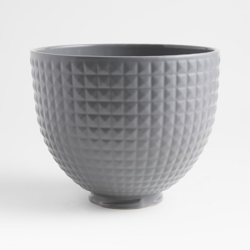 Upgrade your KitchenAid stand mixer with our striking studded bowl, a Crate & Barrel exclusive. The boldly dimensional mixing bowl looks intriguing on your counter and is a joy to work with. Durable ceramic glazed modern matte grey resists chipping, cracking, crazing and staining. Ideal for chilling cookie dough or melting ingredients, the dishwasher-safe bowl boasts impressive heat and cold retention and may be used in the freezer, microwave and oven. The grey studded bowl fits all KitchenAid 4.5- and 5-quart tilt-head stand mixers (sold separately).