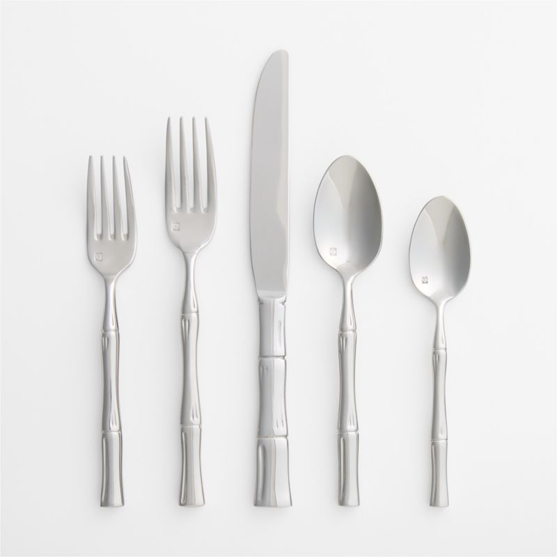 Our Kyoto flatware takes inspiration from the distinctive look of bamboo. Subtly detailed to evoke the plant's distinctive segmented stems, the stainless steel utensils balance unexpected whimsy with sleek and graceful modern design. The mirror-polished flatware boasts exceptional durability, and the generous weight feels well-balanced in hand. This 20-piece set includes four place settings, each with a teaspoon, dinner spoon, salad fork, dinner fork and dinner knife.
