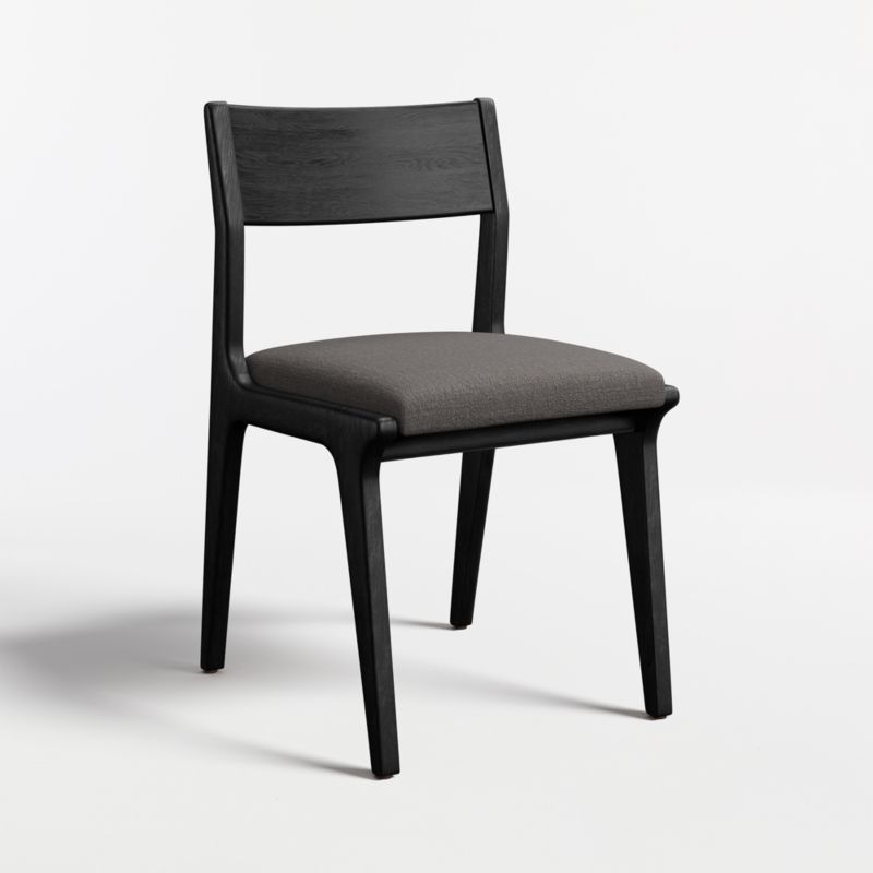 Designed to coordinate with our Lakin dining table, this side chair is a true classic that can sit with any table in our collection. Solid oak stars in the graceful mix of curves and lines seen in the tapered legs, angled back and slanted stance. The inset cushion is covered in a linen-like fabric in dark grey to complement the frame's black finish.