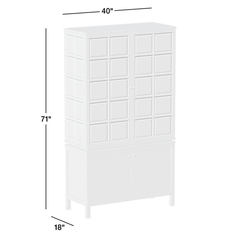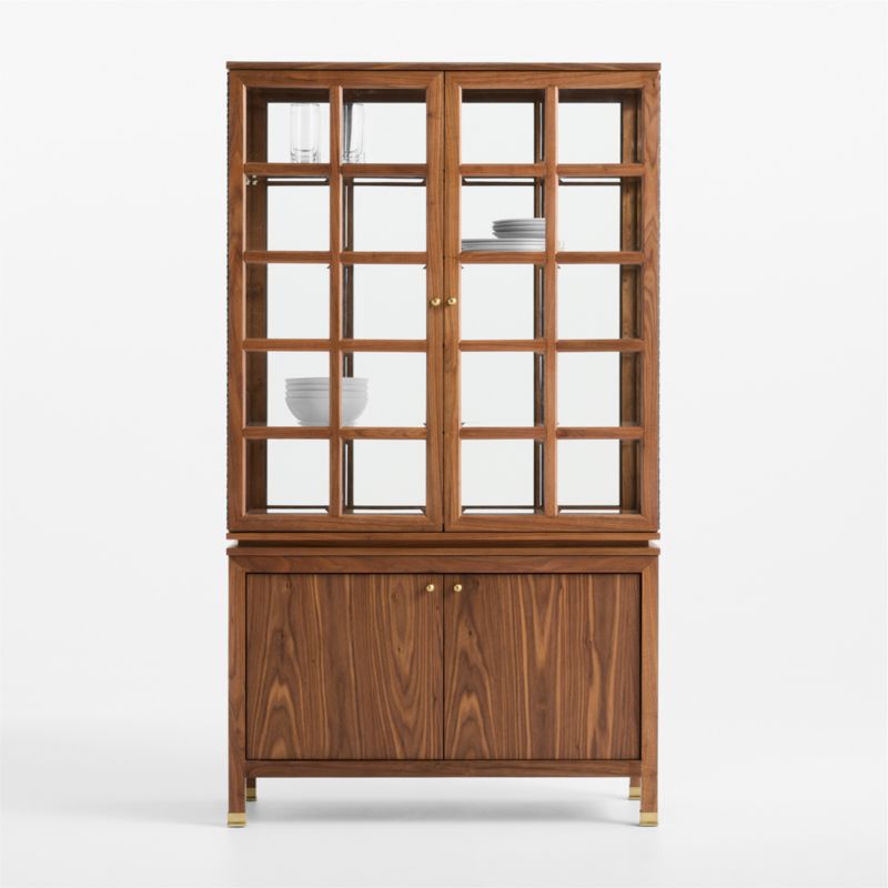 Designed with glass & finished on all four sides, our Lattice cabinet can float in a room to showcase collectibles, glassware, books or fine ceramics. Crafted of statement-making walnut, the heirloom-quality cabinet is meticulously crafted. Beveled walnut mullions frame the upper cabinet, gridding the beveled glass panels geometric pattern. Four adjustable tempered glass shelves provide an airy, variable display of your showcased items. Below, flat-panel doors highlight the wood's active grain, concealing ample storage space. Brass-plating lends a warm glow to the sculpted pulls and protective sabot-capped feet .