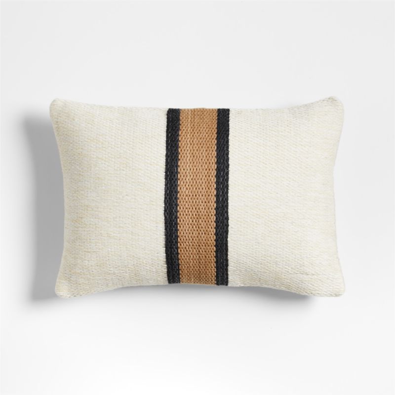 Our Lazio pillow uses a kilim weave-a tight interweaving of warp and weft strands often used to make carpets-to produce a flat surface with heathered color and rustic texture. The off-white pillow features a center tan band bordered with black stripes for a look that's modern and graphic. Our lumbar throw pillow includes your choice of a plush feather-down or lofty down-alternative insert.