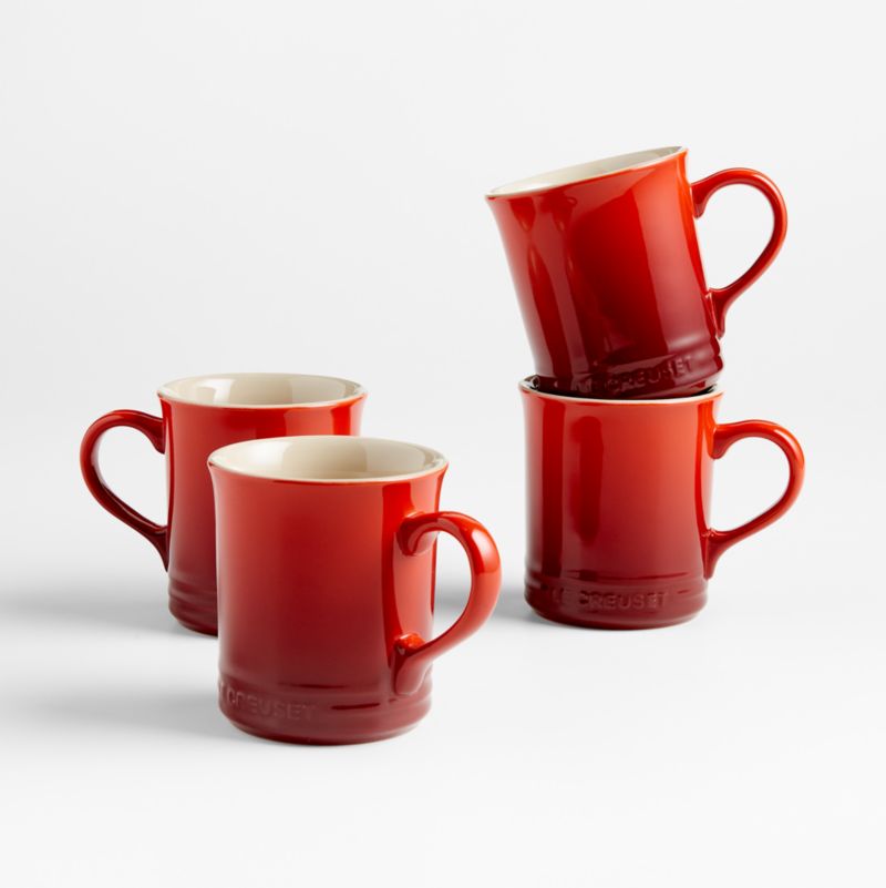 Known for its chef-inspired enamel cookware, Le Creuset introduces premium stoneware dinnerware. The four mugs in this exclusive set are crafted with the same cherry red glaze, graduated color and concentric-ridge detailing found in the celebrated cookware. Non-reactive and chip-, scratch- and stain-resistant, the durable mugs combine with coordinating bowls and dinner and salad plates to set the table in a cheerful shade of red.