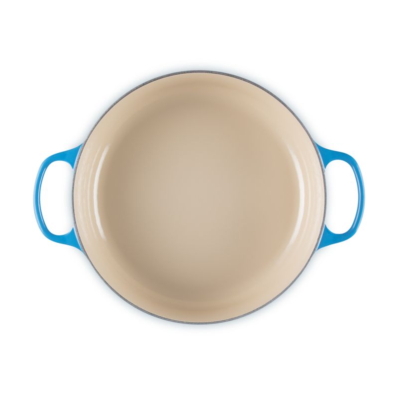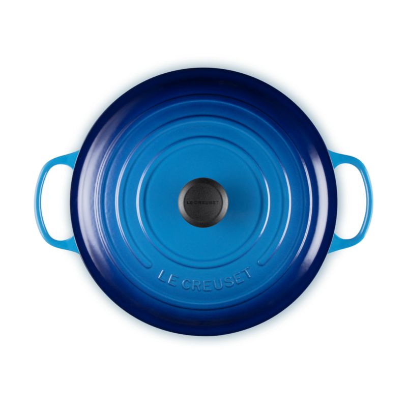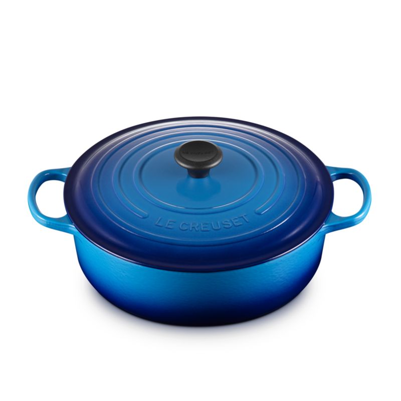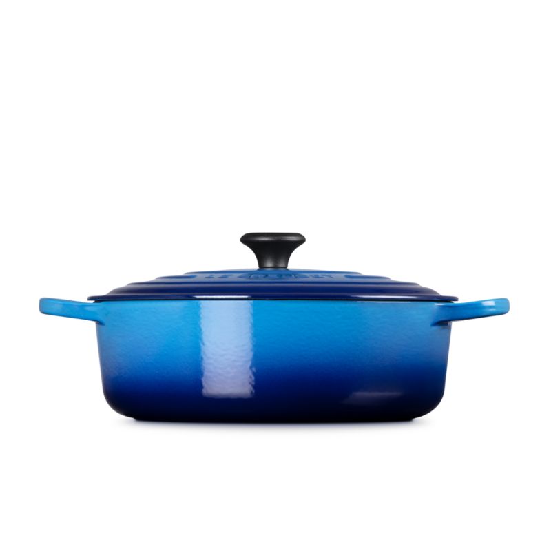 Porcelain enamel in blueberry blue coats this large Dutch oven from Le Creuset. The pot's wide, shallow shape browns and sears to perfection, while the large surface area helps reduce sauces quickly. Cast iron maintains even and consistent heat, and the smooth enamel promotes caramelization, resists stains and prevents sticking for easy cleanup. Generously sized to cook six or seven servings, the deep blue Dutch oven makes for a grand presentation of casual weeknight meals as well as elegant dinners.