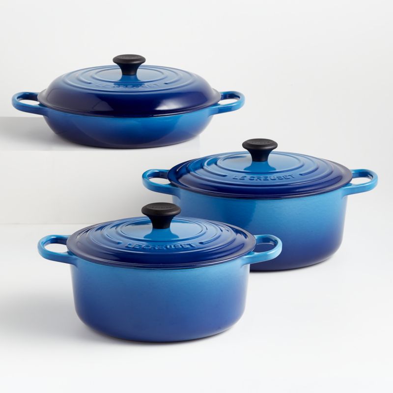 Revered by both professional chefs and home cooks since its 1925 debut, Le Creuset's classic French cookware is prized for its utilitarian good looks, unsurpassed heat retention, and lids that create an even "blanket" of heat. Made of cast iron clad with an enamel finish inspired by blueberries, this generously sized lidded pot is impervious to acid, alkali, odors and stains. The non-reactive cooking surface does not require seasoning and is compatible with all types of heat sources, from gas and electric stoves, to ceramic and glass cooktops, to induction and halogen—even solid fuel and open fire.