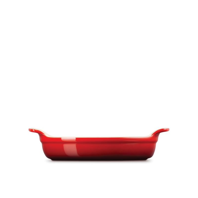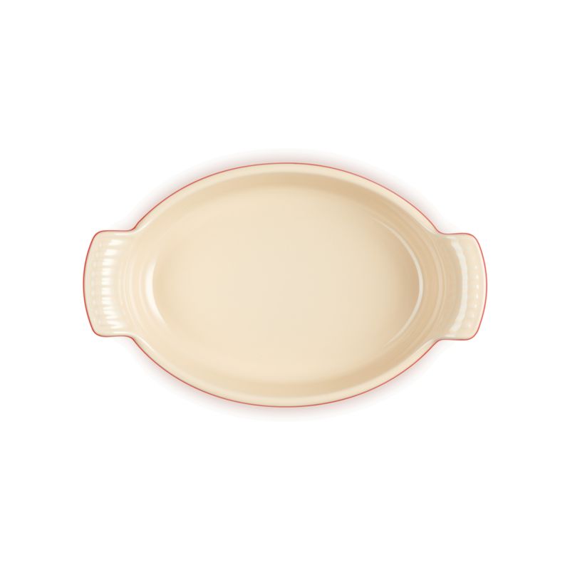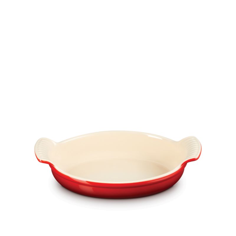 As beautiful as it is functional, the Heritage line of bakeware is based on designs from Le Creuset's archives. This au gratin's wide, shallow proportions make it ideal for dishes with crispy tops and crusts. Glazed in a deep ombre red inspired by cherries, the dense stoneware provides superior heat distribution and temperature retention. The dish resists scratching, staining, cracking and crazing, and its nearly non-stick interior effortlessly releases foods and cleans up easily. Flowing into ridged handles, the graceful oval baking dish goes from oven to table for a timeless presentation.