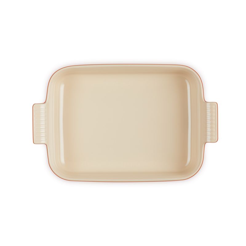 The cherry-red enamel that coats this baking dish adds a vibrant pop to your kitchen while resisting scratches and stains. Crafted of dense stoneware, the rectangular casserole dish blocks moisture absorption to prevent cracking and crazing. The nearly non-stick interior resists sticking, effortlessly releases food and cleans up easily. Based on vintage designs in the Le Creuset archives, this display-worthy dish goes from oven to table for marinating, roasting and serving.