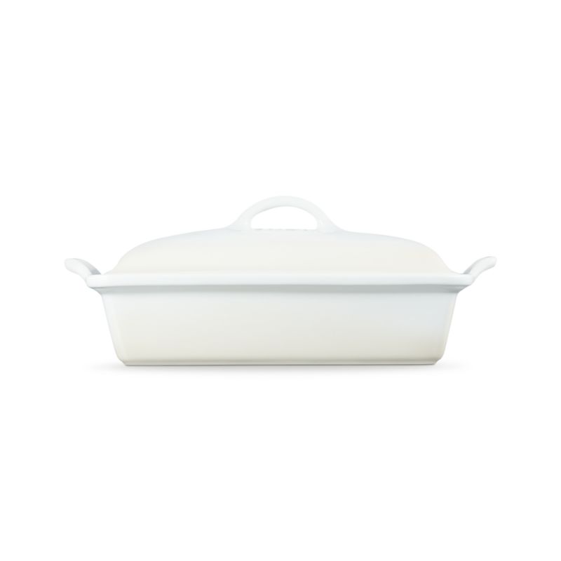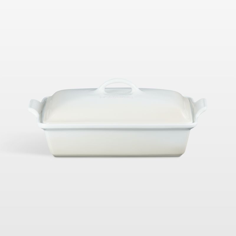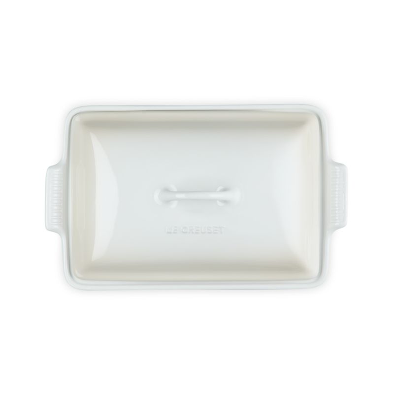 As beautiful as it is functional, the Heritage line of stoneware bakeware provides superior heat distribution and temperature retention, making it ideal for baked goods and roasted dishes. Crafted of dense stoneware, this lidded casserole dish is enameled in warm white inspired by baked meringues. The essential baker resists scratching, staining, cracking and crazing, and its nearly non-stick interior effortlessly releases foods. The lid seals in moisture and makes it easy to tote dishes to potlucks and picnics. Based on designs from Le Creuset's archives, the baking dish goes from oven to table for a timeless presentation.