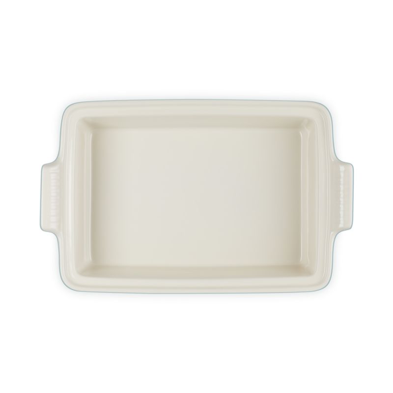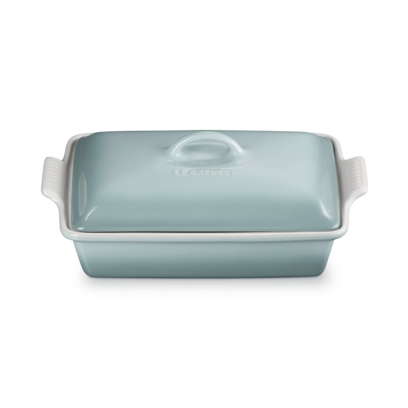 Enamel in warm blue-green glazes this gorgeous covered casserole. Based on vintage designs from Le Creuset's early days, the baking dish features traditional styling with scalloped handles. Crafted of dense stoneware, the rectangular pan blocks moisture absorption to prevent cracking and crazing. The nearly non-stick interior resists sticking, effortlessly releases food and cleans up easily. Ideal for baking and serving fruit crumbles, lasagna and more, the lidded baker goes beautifully from the oven to the table.