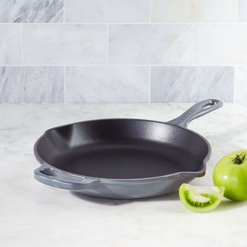 Le Creuset's cast-iron skillet is clad in smooth enamel in our own exclusive shade of graphite grey, rendering each piece impervious to acid, alkali, odors and stains. Its non-reactive cooking surface doesn't require seasoning, and the skillet is compatible with all types of heat sources, even solid fuel and open fire. Convenient helper handle makes it easy to maneuver the skillet for cooking and serving. Revered by both professional chefs and home cooks since its 1925 debut, Le Creuset's classic French cast iron cookware is prized for its utilitarian good looks, unsurpassed heat retention.