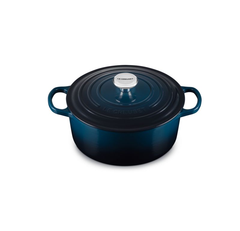Our Le Creuset Dutch oven showcases a porcelain enamel coating in inky blue, a stunning shade you'll only find at Crate & Barrel. Impervious to acid, alkali, odors and stains and able to maintain consistent heat, the pot has a smooth interior that promotes caramelization. The close-fitting lid creates a blanket of heat for moist and even cooking. The midnight blue pot is perfect for cooking five to six servings of stew, roast chicken, braised beef or baked bread.