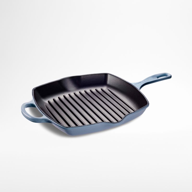 This square grill pan imparts authentic grill marks with raised ridges that also help to drain away fat and juices. Great for fish, tofu and paninis, the pan is clad with enamel finish in chambray and features a non-reactive cooking surface that does not require seasoning. This grill pan is compatible with all types of heat sources and impervious to acid, alkali, odors and stains. Wide, half-moon handles give a firm grip for transporting the gorgeous grill pan from stove to table.