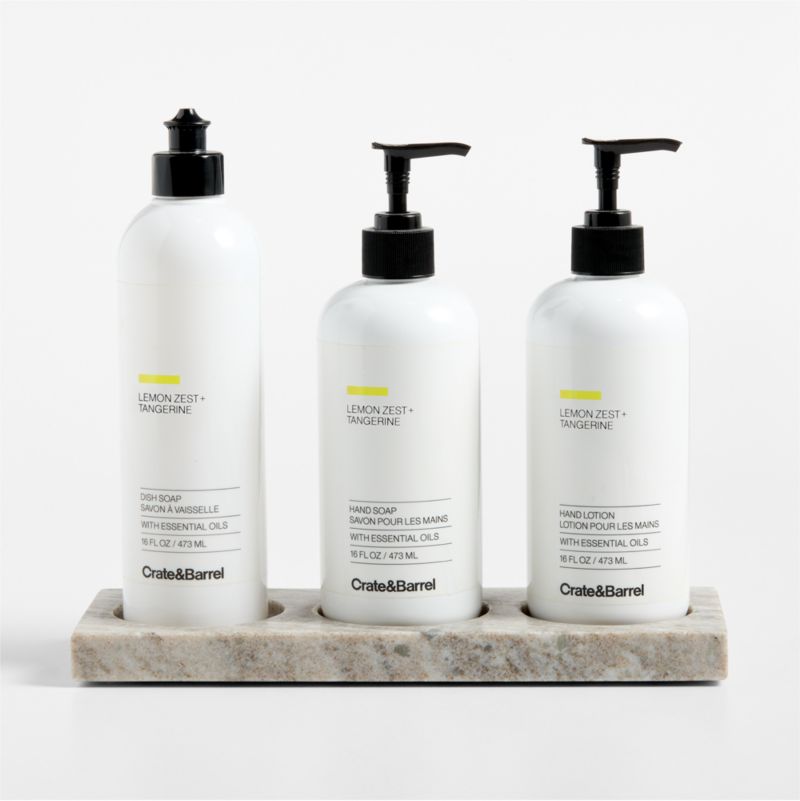Wash dishes and clean and soothe hands with the sweet, bright fragrances of lemon zest and tangerine featured in this exclusive four-piece set. Our dish soap tackles grease and residue with ease. Once the dishes are done, our hand soap moisturizes with sunflower seed oil and aloe vera as it cleans, while the hand lotion boasts mango seed oil and aloe. All three are made with plant-based formulas scented with essential oils that leave behind a fresh, clean aroma of lemongrass and geranium against a backdrop of zesty citrus. Cut, finished and polished by hand, the tuscan marble caddy keeps the bottles right at hand while looking neat and stylish.