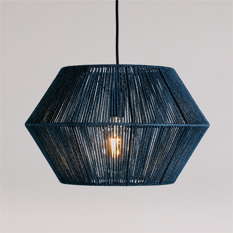 Our Liam Geo Pendant Ceiling Light brings a modern touch of the tropics to kids' spaces. Suspended from an adjustable fabric cord, the pendant light features an open geometric shade woven of navy blue paper rope. The chunky fiber and loose weave allow light to filter through beautifully. Show off your favorite display-worthy bulb, or choose an understated option to keep the focus on the natural material and modern design.
