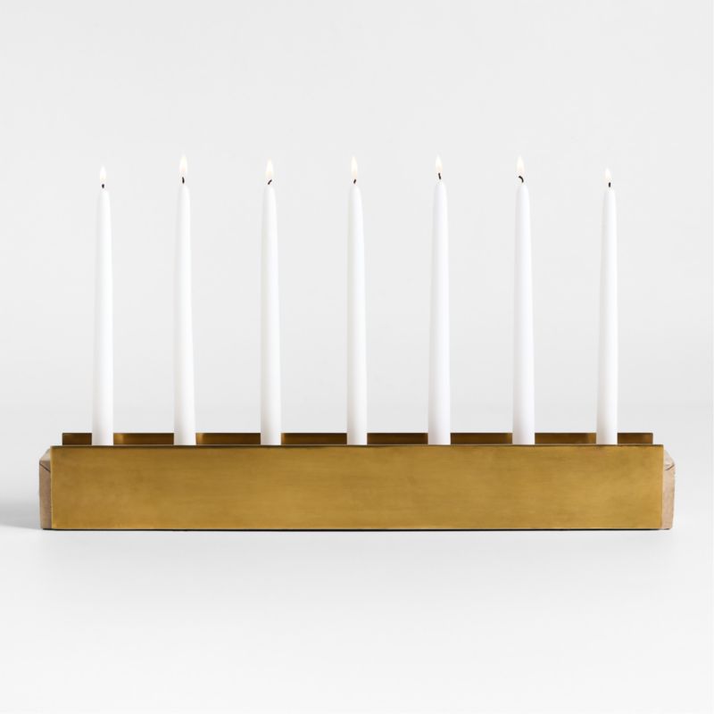 Playfully mixing materials, Brigette Romanek's Liner candelabra lights up the room with modern style. The candle holder sandwiches a block of travertine between two slender brass-finished panels that gleam in the glow of seven tapers. We adore the juxtaposition of the clean lines and glam finish with the natural stone's fascinating fissures and other organic textures. Add white tapers for a fresh look, black candles to add a bit of drama, or go eclectic with a mix of hues that suit your tablescape. Perfectly scaled for the dining table Brigette Romanek designed for Crate & Barrel, the candelabra also shines on a coffee table, fireplace mantel, or entryway console.