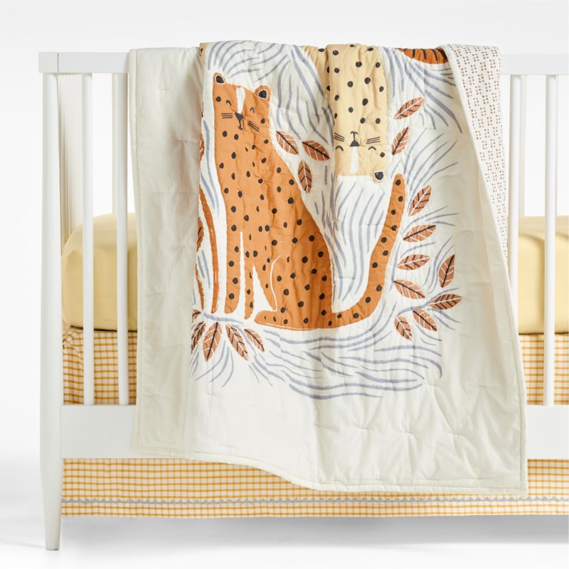Our fiercely cute Little Leopards Quilt showcases screen-printed illustrations of sleepy cats and tropical flora overlaid with intricate embroidery. The soft organic cotton piece is perfect for tummy time and snuggling—and even striking enough to hang on a wall. For a coordinated look in a young cub's den, pair it with our Washed Organic Cotton Baby Crib Fitted Sheet in Straw Yellow, which has a casual, relaxed look and is soft on the skin. And as a tailored and totally charming finishing touch, add our Windowpane Crib Skirt, a modern reinterpretation of a vintage pattern with a soft-blue embroidered border.