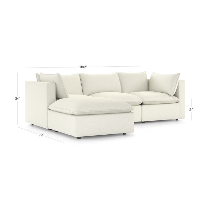 Our popular Lotus four-piece sectional strikes the perfect balance between clean, modern style and cloud-like comfort. Three chairs combine to form an inviting sofa, with a generously proportioned ottoman that switches from left to right for chaise-like lounging. Nestled on a low shelter frames, deeply plush pillows are key to this sectional's lounge-worthy luxury, packed with a fluffy down blend and just the right amount of inner support to look crisp. Just fluff and rotate to keep Lotus company-ready. The Lotus 4-Piece Reversible Sectional with Ottoman is a Crate and Barrel exclusive.
