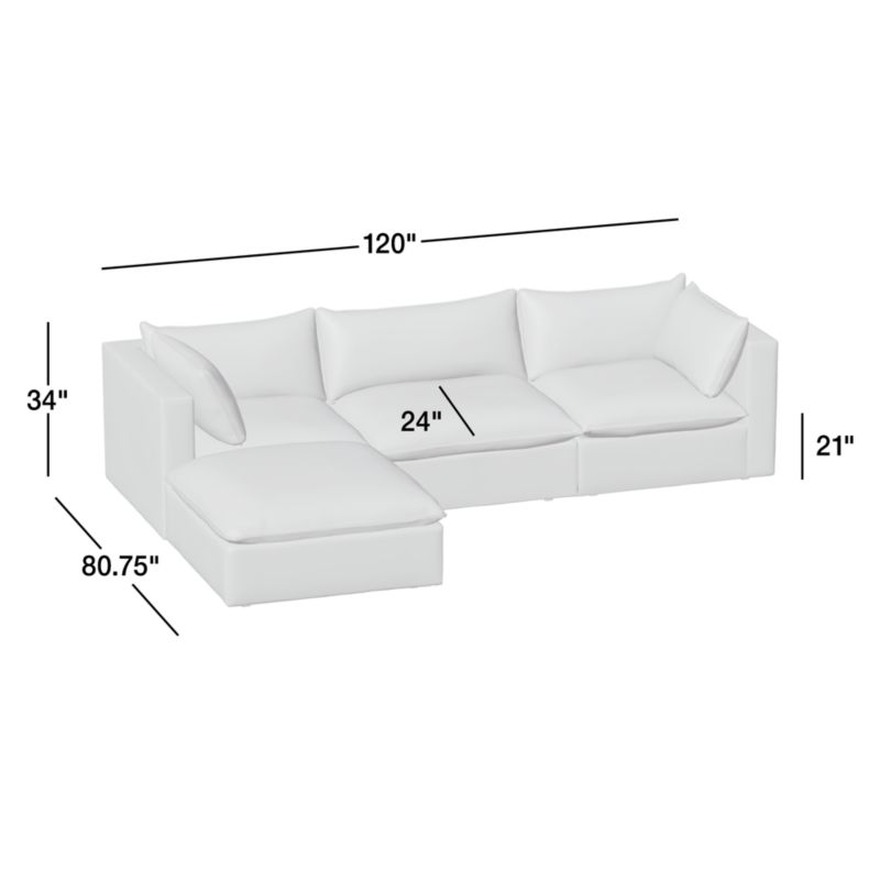 Our popular Lotus four-piece sectional strikes the perfect balance between clean, modern style and cloud-like comfort. Three chairs combine to form an inviting sofa, with a generously proportioned ottoman that switches from left to right for chaise-like lounging. Nestled on a low shelter frames, deeply plush pillows are key to this sectional's lounge-worthy luxury, packed with a fluffy down blend and just the right amount of inner support to look crisp. Just fluff and rotate to keep Lotus company-ready. The Lotus 4-Piece Reversible Sectional with Ottoman is a Crate and Barrel exclusive.