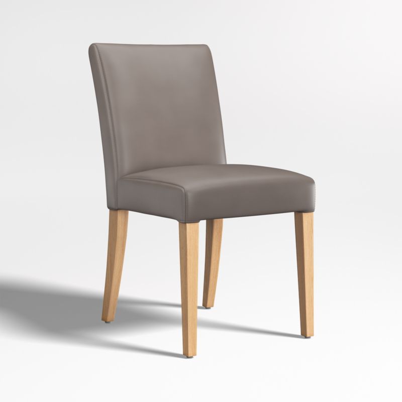 With a roomy cushioned seat and back, our Lowe dining chair is designed for tableside lingering. Sleek grey leather tailors the cushioned, tight seat in sophistication, partnering perfectly with slim, ebony-finished hardwood legs. Our Lowe collection's many seating options in an array of coordinating leathers and fabrics mix and match for the perfect look. The Lowe upholstered leather dining chair is a Crate & Barrel exclusive.