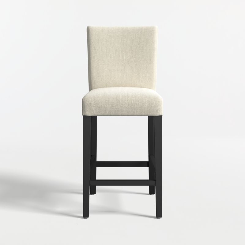 With a roomy cushioned seat and back, our Lowe counter stool is designed for lingering at counters or high-dining tables. Linen-blend ivory upholstery tailors the cushioned, tight seat in sophistication, pairing perfectly with slim, ebony-finished hardwood legs. Our Lowe collection's many seating options in an array of coordinating leathers and fabrics mix and match for the perfect look. The Lowe upholstered counter stool is a Crate & Barrel exclusive.